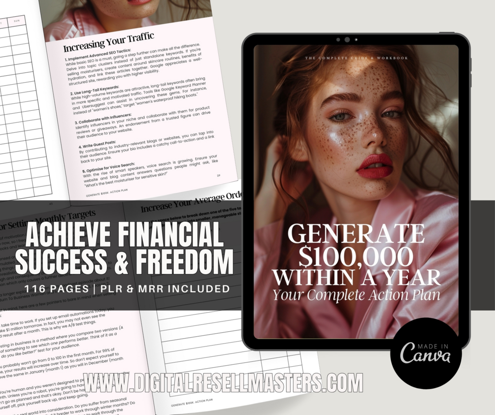 This eBook provides a comprehensive roadmap to generating $100k within a year. Whether you're an aspiring entrepreneur or an established business owner, you'll find actionable strategies, insights, and exercises tailored to help you reach this ambitious goal.